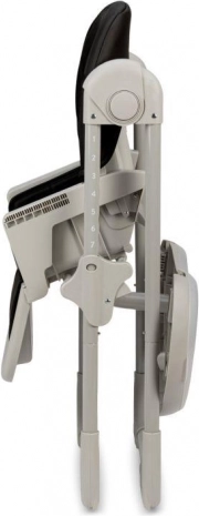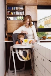 Der Stuhl hat eine zweistufige Tablettverstellung und, was wichtig ist, das äußere Tablett ist spülmaschinengeeignet.