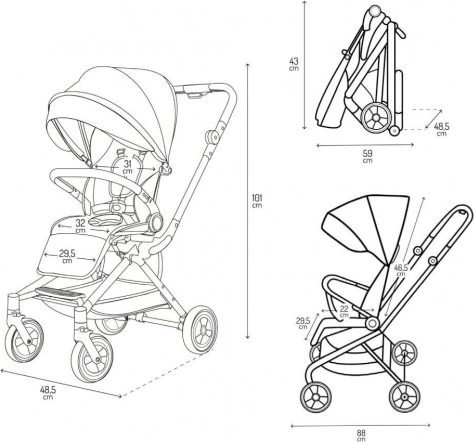 Der Kinderwagen lässt sich mit einer Hand auf kompakte Maße zusammenklappen und dank integriertem Griff bequem tragen. Dreistufig verstellbare Rückenlehne inklusive Liegeposition, verstellbare Fußstütze und erweiterbares Verdeck bieten maximalen Komfort fürs Kind. Für Sicherheit sorgen 5-Punkt-Gurte, ein abnehmbarer Bügel und eine doppelte Sicherung gegen unbeabsichtigtes Zusammenklappen.
