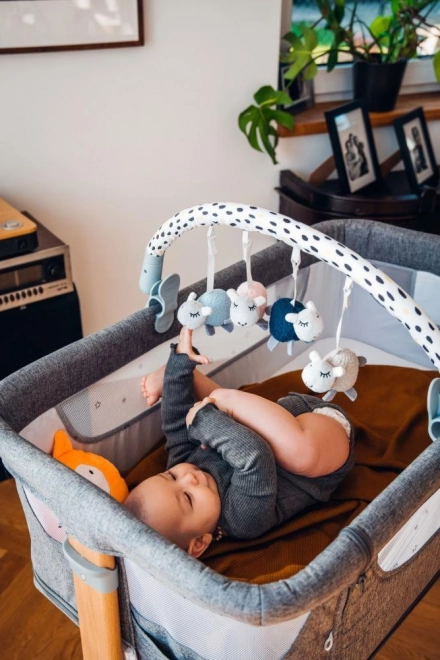 In dieser Zeit ist es wichtig, dass das Kind Spielzeuge in Reichweite hat, wenn es auf dem Bauch liegt. Die Schäfchen am Spielbogen MoMi JOY ermutigen das Kind zu den ersten Versuchen, nach ihnen zu greifen.