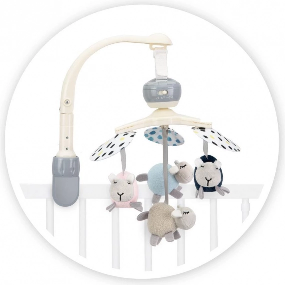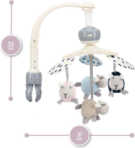 Enthalten sind weiche sensorische Spielzeuge aus hochwertigen Textilien (Samt, Filz) mit Knister- und Quietsche-Elementen. Die Spielzeuge lassen sich leicht abnehmen und separat verwenden oder in der Waschmaschine waschen. Die langsame Rotation fördert die visuelle Wahrnehmung und Konzentration des Babys.