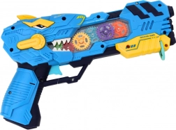 Entdecken Sie actionreichen Spaß mit der Pistole in Dinosaurierform, die Dinosaurierprojektionen, Lichteffekte und Soundeffekte kombiniert. Jeder Druck auf den Abzug startet eine Lichtshow mit rotierenden, beleuchteten Zahnrädern und realistischen Geräuschen.