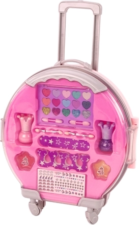 .Das Make-up- und Nageldekorationsset für Kinder ist in einem niedlichen rosa Köfferchen mit Rollen und praktischem Tragegriff verpackt – wie ein echter Koffer, ideal für unterwegs.