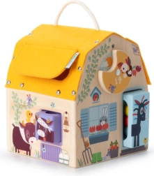 Das Filzdach mit praktischer Trageschlaufe erleichtert das Mitnehmen. Die kompakten Maße von 15 × 15 × 18,5 cm passen in jedes Kinderzimmer und sind ideal auf Reisen. Das Spielzeug ist für Kinder ab 12 Monaten geeignet und unterstützt Selbstständigkeit und Entdeckerfreude.