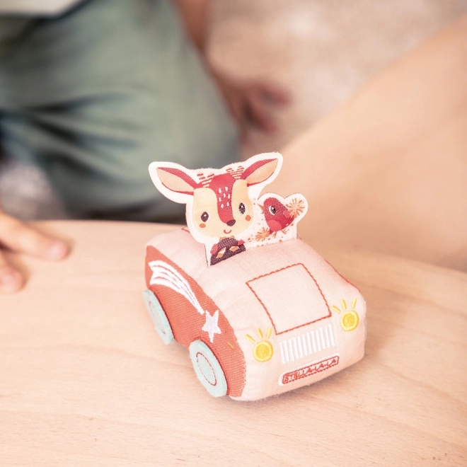 Das weiche Fahrzeug ist mit Rehkitz Stella und Vogel Robin verziert, die der Spielfreude und Attraktivität des Spielzeugs beitragen.