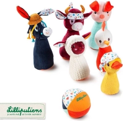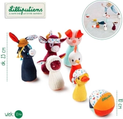 Entdecken Sie den Zauber der weichen Lilliputiens-Kegel aus der Kollektion Bauernhof. Die fröhlichen Helden – Esel Ignace, Kuh Rosalie, Schweinchen Simon, Schaf Yvon, Henne Paulette und Ente Gaston – haben einen stabilen, leicht beschwerten Boden, sodass sie sich leicht aufstellen und ebenso leicht umwerfen lassen. Dazu gehört auch ein bunter Plüschball mit Glöckchen, der zum Werfen und Rollen animiert.