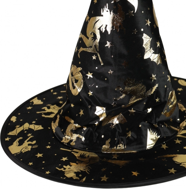 Stilvoller Kinder-Hexenhut, ideal für Karneval, Aufführungen und Halloween. Der schwarze Stoffhut ist mit goldenen magischen Motiven wie Sternen, Fledermäusen und Hexen verziert. Dank der klassischen Kegelform und der breiten Krempe ergänzt er jedes Kostüm mühelos und verwandelt kleine Zauberer in einen Halloween-Star.