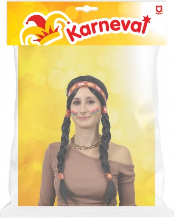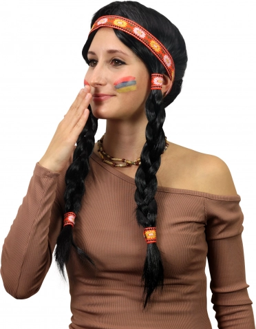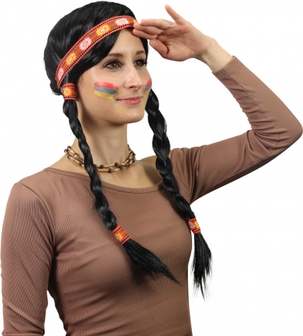 Zur Perücke gehören ein stilvolles Stirnband und gemusterte Bänder an den Zöpfen, die den indianischen Look betonen und dem Kostüm einen einzigartigen Charakter verleihen.