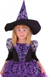 Zum Kostüm gehört ein passender Hut, der mit demselben Muster wie das Kleid verziert ist und dem Kostüm eine authentische Hexenoptik verleiht.