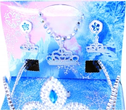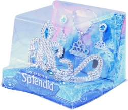 Bereiten Sie Ihrer kleinen Prinzessin Freude mit diesem zauberhaften Set, das eine Krone, Ohrringe, eine Halskette und einen Ring mit blauen Zierelementen enthält.