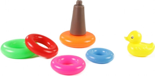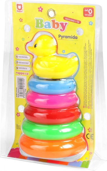 Bunte Kinderpyramide mit Ente ist das ideale Spielzeug für die Kleinen. Dank der fünf bunt gefärbten Ringe, die sich stapeln lassen, fördert sie die visuelle Stimulation und die motorischen Fähigkeiten.