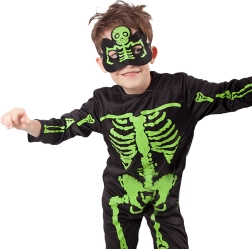 Stylisches Kinder-Skelettkostüm mit auffälligen neongrünen Knochen auf schwarzem Hintergrund. Ideal für Halloween, Karneval und Mottopartys. Enthalten sind ein Overall und eine Maske für einen kompletten gruseligen Look. Bequemer Stoff, leichtes An- und Ausziehen und effektvoller Neon-Print sorgen für jede Menge Spaß und Aufmerksamkeit.