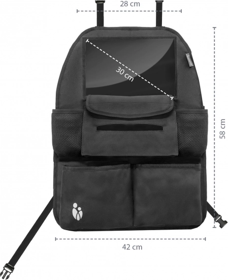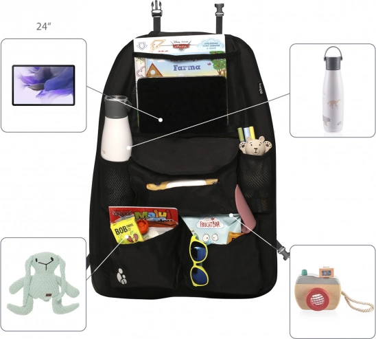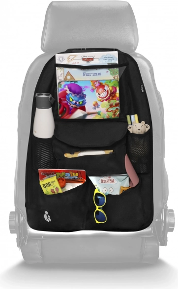 Der clevere Sitz-Organizer schützt nicht nur das Tablet und ermöglicht einfachen Zugriff darauf, sondern bietet auch reichlich Stauraum für Flaschen, Taschentücher und Spielzeug.
