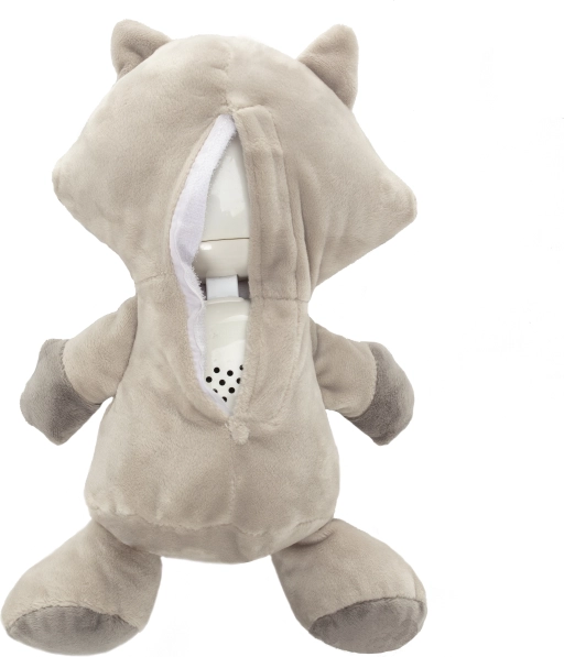 Das batteriebetriebene Gerät ist sicher auf dem Rücken des Waschbären verstaut und durch einen Reißverschluss geschützt. Dieses Einschlafhilfs-Plüschtier gibt Kindern ein Gefühl der Sicherheit und unterstützt regelmäßige Schlafgewohnheiten.