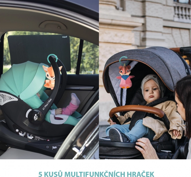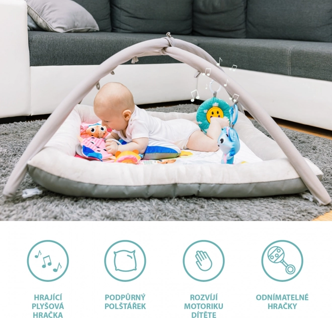 Die Spielzeuge lassen sich leicht vom Bogen abnehmen und am Kinderwagen, Autositz oder am geformten Stützkissen befestigen. Dieses dient als Unterstützung beim Bauchliegen. Älteren Kindern hilft es beim Üben der richtigen Position zum Krabbeln.