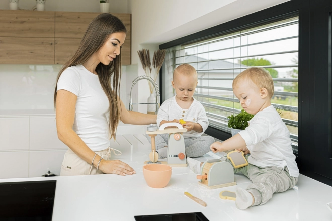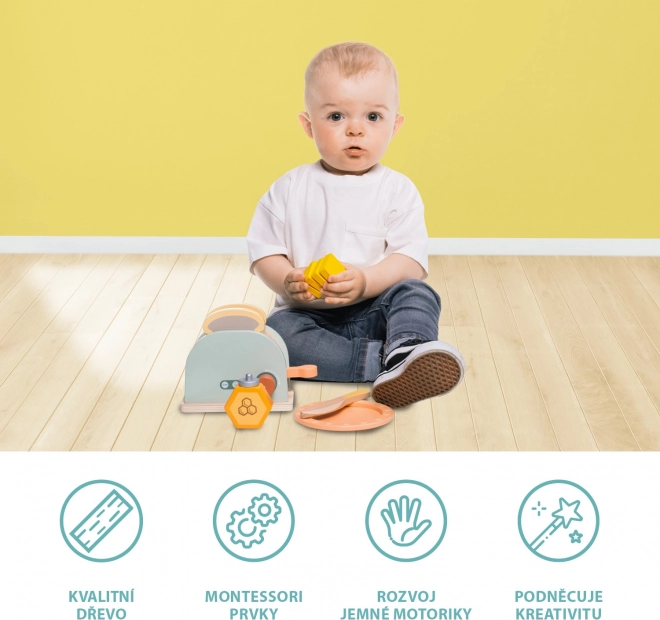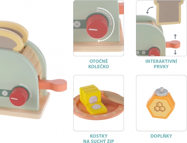 Die Zubereitung von Speisen macht Spaß – auch mit solchen aus Holz. Das Set enthält einen Toaster mit einer Scheibe Toast. Nach dem Drücken des Hebels springt der Toast aus dem Toaster. Ebenfalls enthalten sind ein Teller, ein Messer und Butter, damit das Frühstück komplett ist. Das Spielzeug fördert die Koordination, das räumliche Vorstellungsvermögen und die Geschicklichkeit der Hände. Der Toaster ist aus hochwertigem Holz und wasserbasierten Farben gefertigt.