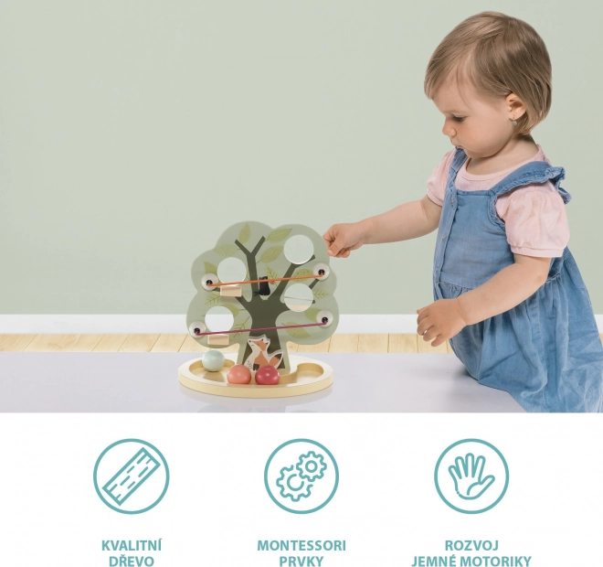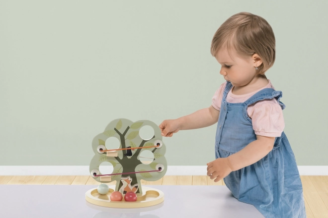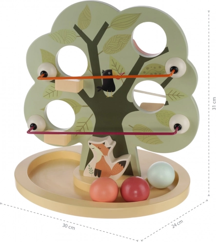 Das niedliche Holzspielzeug in Baumform hat mehrere Öffnungen zum Durchstecken der Kugeln. Eine Rinne am unteren Teil fängt die Kugeln auf, sodass das Kind beobachten kann, wie sie hinunterrollen. Das Spielzeug fördert Fantasie, Denken und die Handkoordination.