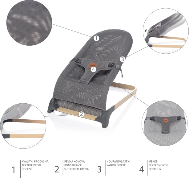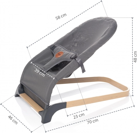 Dank der stabilen und zugleich flexiblen Metallkonstruktion ermöglicht die Liege ein Schaukeln durch das eigene Körpergewicht des Kindes oder die Eltern können das Kind wiegen. Das Schaukeln ist somit völlig natürlich. Das Baby lernt schnell, wie es die Wippe in Bewegung setzt, und entwickelt so motorische Fähigkeiten und Gleichgewicht.