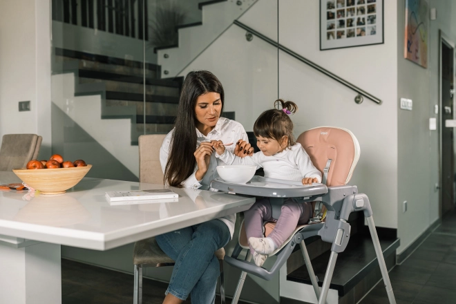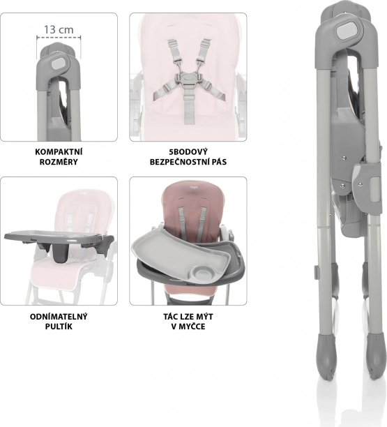 Ein Hochstuhl, der sich vollständig an die Bedürfnisse von Eltern und Kindern anpasst. Die stabile, robuste Konstruktion ist sehr leicht und lässt sich mithilfe von zwei seitlichen Sicherungen einfach zusammenklappen. Im zusammengeklappten Zustand steht er selbstständig. Dank seiner kompakten Abmessungen lässt sich der zusammengeklappte Hochstuhl auch in kleinen Räumen unterbringen. Zusammengeklappt ist er nur 13 cm breit.