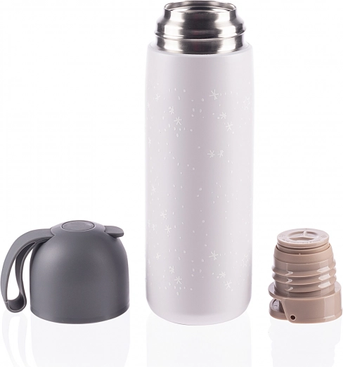 Eine hochwertige Thermoflasche für Getränke mit einem Volumen von 400 ml hält heiße Getränke bis zu 12 Stunden und kalte bis zu 24 Stunden warm bzw. kalt. Sie besteht aus hochwertigem Edelstahl, der korrosionsbeständig ist. Der dichte Deckel sorgt dafür, dass nichts ausläuft, und der obere Ausgießverschluss ermöglicht bequemes Einschenken, ohne sich zu verschütten – selbst während der Autofahrt auf unebenen Straßen. Dank des doppelten Verschlusses können Sie zudem sicher sein, dass sich ein Kind nicht am Inhalt verbrüht. Der Deckel der Thermosflasche kann als Becher verwendet werden.