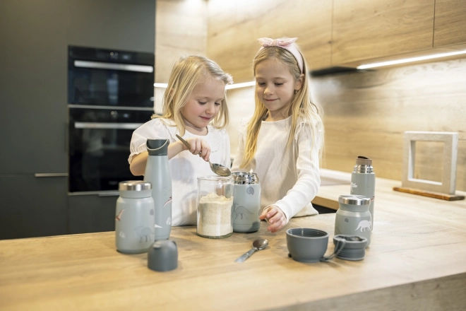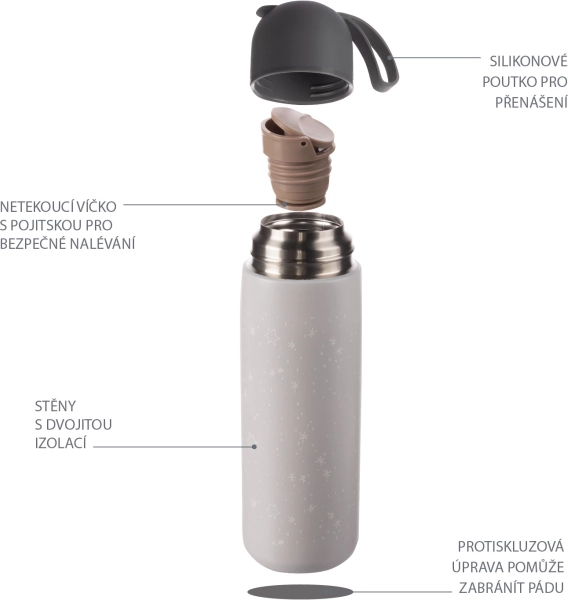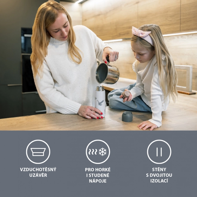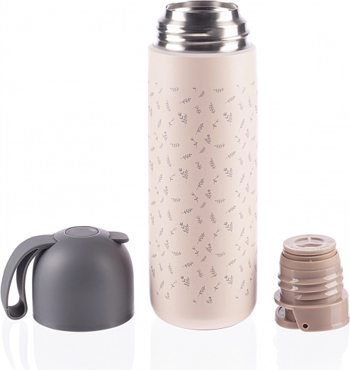 Hochwertige Thermosflasche für Getränke mit einem Volumen von 400 ml hält warme Getränke bis zu 12 Stunden und kalte bis zu 24 Stunden. Sie besteht aus hochwertigem, korrosionsbeständigem Edelstahl. Der dichte Deckel sorgt dafür, dass die Thermosflasche nicht ausläuft, und der obere Ausguss zum bequemen Einschenken verhindert Verschütten, selbst bei einer Autofahrt auf unebener Straße. Dank des doppelten Verschlusses können Sie außerdem sicher sein, dass sich Ihr Kind nicht an der Flüssigkeit verbrüht. Der Deckel der Thermosflasche kann als Becher verwendet werden.