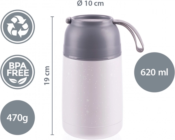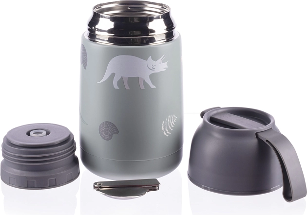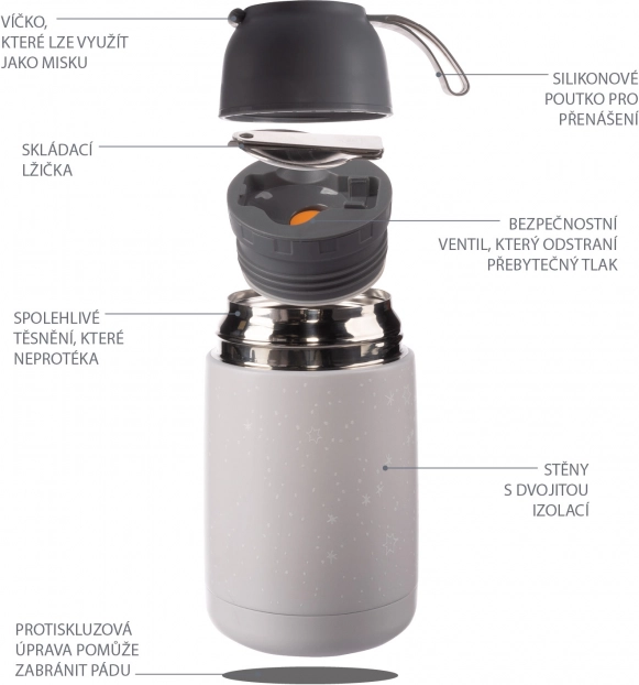 Im Lieferumfang ist ein praktischer, faltbarer Löffel enthalten, der perfekt in den Verschluss passt, sodass Sie Ihrem Kind überall warmen Brei oder Suppe servieren können. Der Deckel der Thermoskanne kann als Becher oder Schüssel verwendet werden. Der obere Verschluss ist mit einem Sicherheitsventil ausgestattet, das überschüssige, druckbildende Luft ablässt. Durch das Ablassen der komprimierten Luft lässt sich der Behälter leicht öffnen und Verbrühungen durch Dampf werden vermieden.
