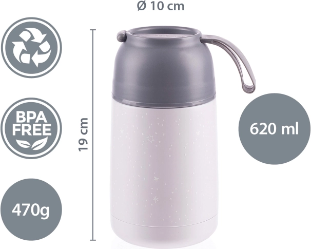 Zum Lieferumfang gehört ein cleverer, klappbarer Löffel, der perfekt in den Verschluss passt, sodass Sie Ihrem Kind überall warmen Brei oder Suppe servieren können. Der Deckel der Thermoskanne kann als Becher oder Schüssel verwendet werden. Der obere Verschluss ist mit einem Sicherheitsventil ausgestattet, das überschüssige Luft ablässt, die Druck aufbaut. Durch das Ablassen der komprimierten Luft lässt sich der Behälter leicht öffnen und Verbrühungen durch Dampf werden vermieden.