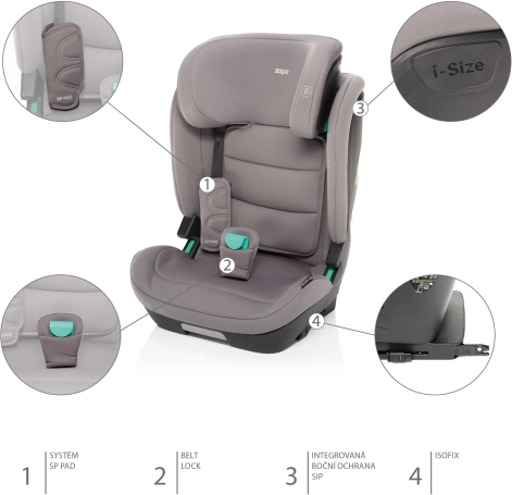 Für den Fall eines Frontalaufpralls ist der Sitz mit SP PAD ausgestattet, die die Belastung von Kopf, Halswirbelsäule und Brustkorb reduzieren. Die Belt-Lock-Funktion fügt beim Anschnallen einen 4. Punkt hinzu und verringert so bei einem Frontalaufprall den Druck auf den Bauch des Kindes. Integrierter Seitenaufprallschutz (SIP) über die gesamte Länge schützt das Kind auch im unteren Bereich. Die Erfüllung der neuesten i-SIZE-Norm garantiert Sicherheit während der gesamten Nutzungsdauer.
