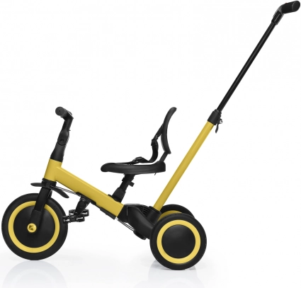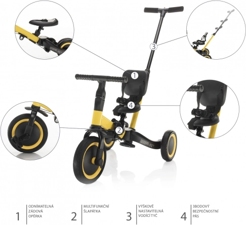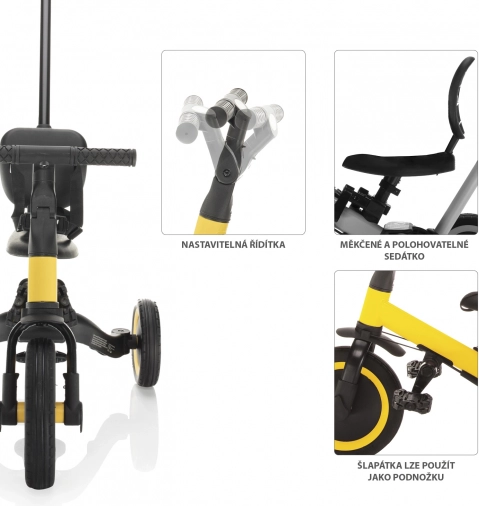 Ein Fahrzeug deckt drei Entwicklungsphasen ab: 18–36 Monate Dreirad (mit/ohne Schiebestange), 36–48 Monate Laufrad und 48–60 Monate Fahrrad.