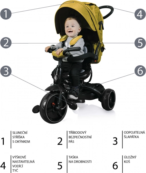 Das Dreirad Citi Trike in der attraktiven Farbe Curry Yellow ist für Kinder im Alter von 10 Monaten bis 3 Jahren bestimmt und bietet eine maximale Tragkraft von 30 kg. Es enthält eine Führungstange mit einstellbarer Höhe für einfaches Manövrieren: