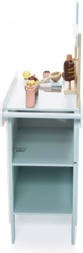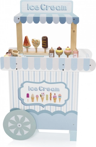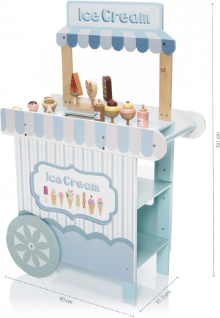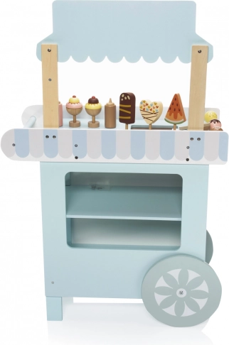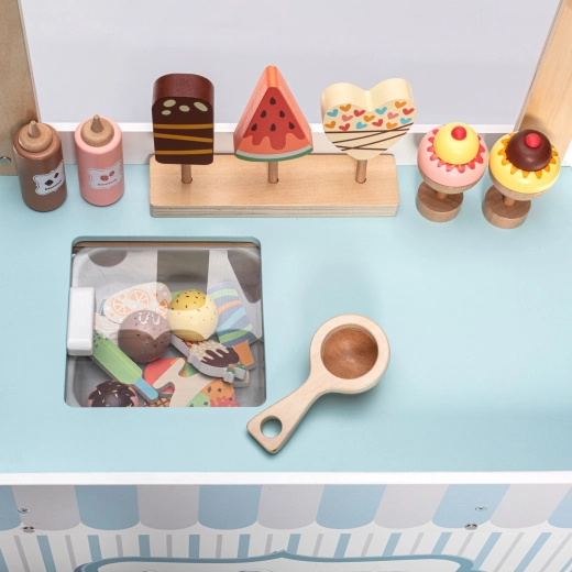 Der hölzerne fahrbare Eiscremestand ist ein ideales Werkzeug zur Förderung der kindlichen Vorstellungskraft und sozialen Fähigkeiten. Dieses sorgfältig gestaltete Set ist mit allen notwendigen Utensilien ausgestattet, einschließlich realistischer Eisspezialitäten und eines Gefrierschranks, um das Eis immer frisch zu halten. Kinder können Eismacher spielen und leckere Eisköstlichkeiten kreieren.