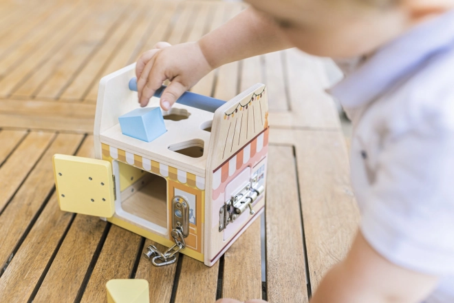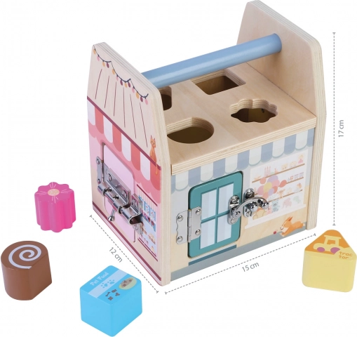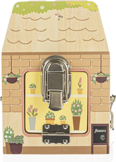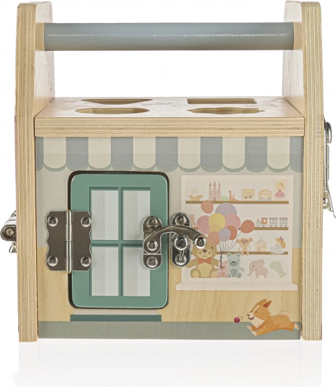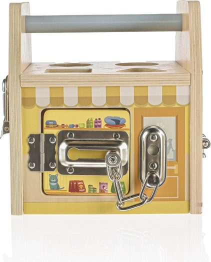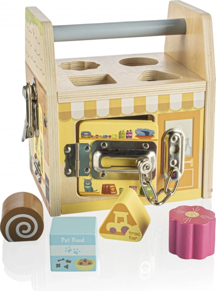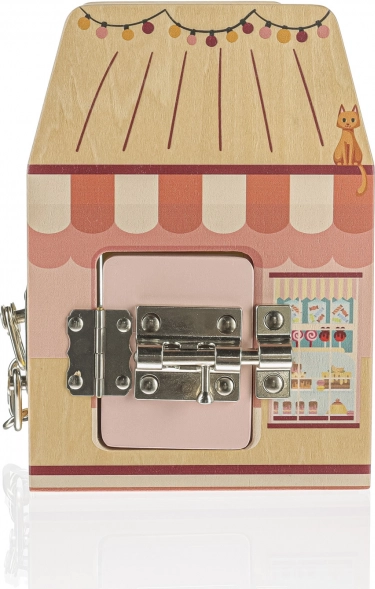 Jede Seite dieses Holzwürfels stellt ein anderes Geschäft dar und jedes Geschäft hat selbstverständlich sein eigenes Spezialschloss zum Schutz vor Dieben. Beim Spielen mit den Schlössern lernen Kinder logisches und räumliches Denken.