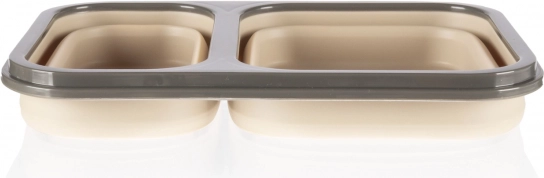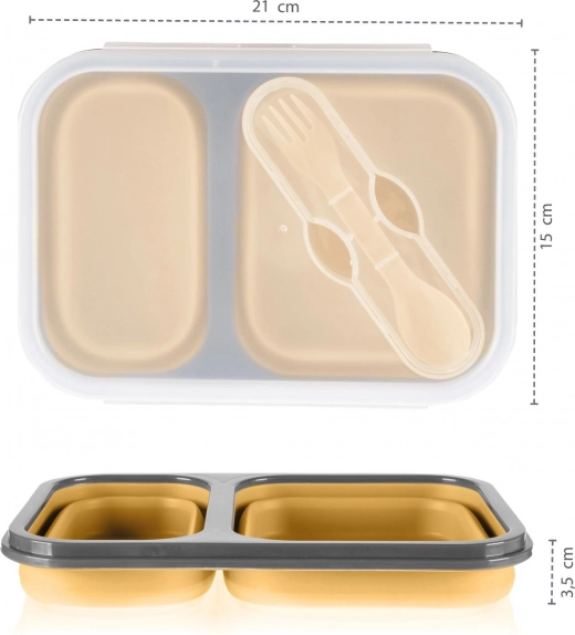 Diese Lunchbox besteht aus sicherem, lebensmittelechtem Silikon, das ungiftig und bruchsicher ist. Ein großer Vorteil ist, dass sie sich nach dem Verzehr des Inhalts leicht zusammenfalten lässt – so reduziert sie ihr Volumen um bis zu 60 % und ist der ideale, kompakte Begleiter für Ausflüge. Der Deckel schließt sehr gut und hat ein integriertes Fach für Besteck; Löffel und Gabel sind in einem praktischen Etui enthalten.