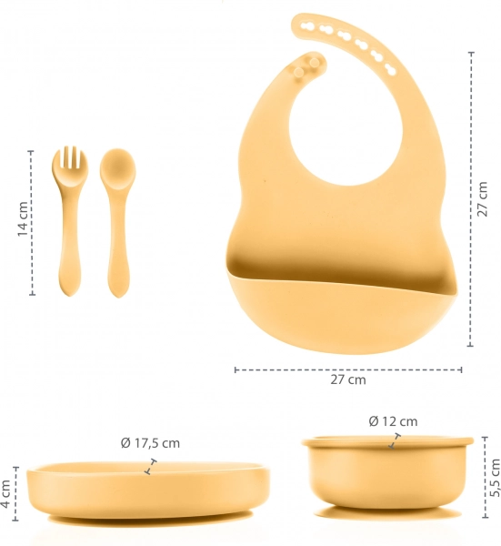 Das Geschirrset aus lebensmittelechtem Silikon enthält eine Schüssel mit erhöhtem Rand und Saugnapf, einen geteilten Teller mit Saugnapf, ein verstellbares Lätzchen und einen Löffel.