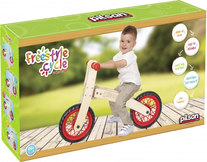Starten Sie die Fahrradreise Ihres Kindes mit dem Laufrad Pilsan Freestyle. Dank der Holzkonstruktion, der stabilen Geometrie und der attraktiven roten Farbe werden Kinder das Fahren schnell lieben. Die kompakten Abmessungen sorgen für eine komfortable Handhabung und bieten gleichzeitig genügend Raum für natürliches und sicheres Fahren.