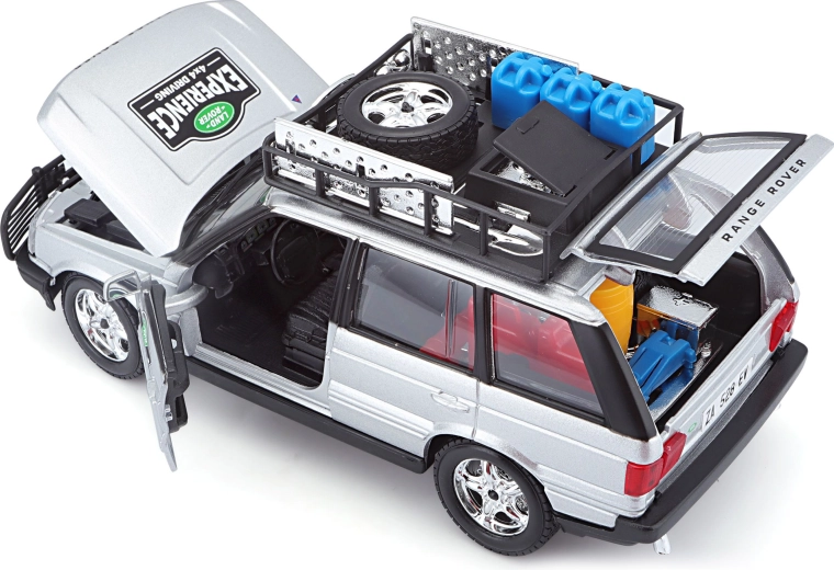 Detailliertes Metallmodell 1:24 des ikonischen RANGE ROVER in Silber begeistert Sammler und Kinder. Es bietet öffnende Teile, frei drehende Räder und zahlreiche realistische Offroad-Zubehörteile auf dem Dachträger. Ein tolles Geschenk und ein stylisches Stück für die Vitrine.