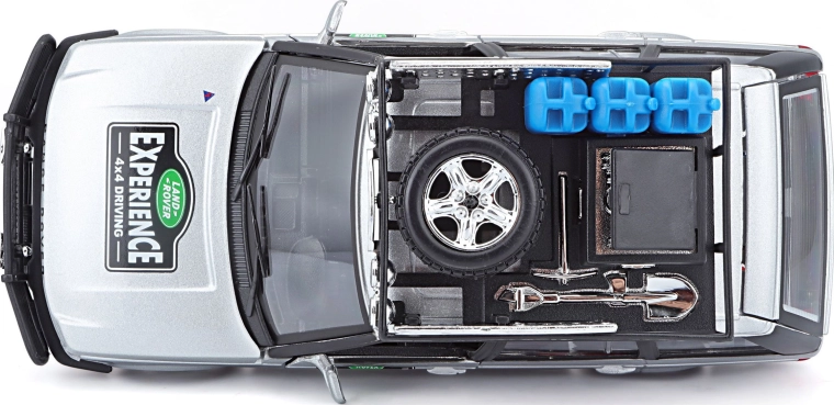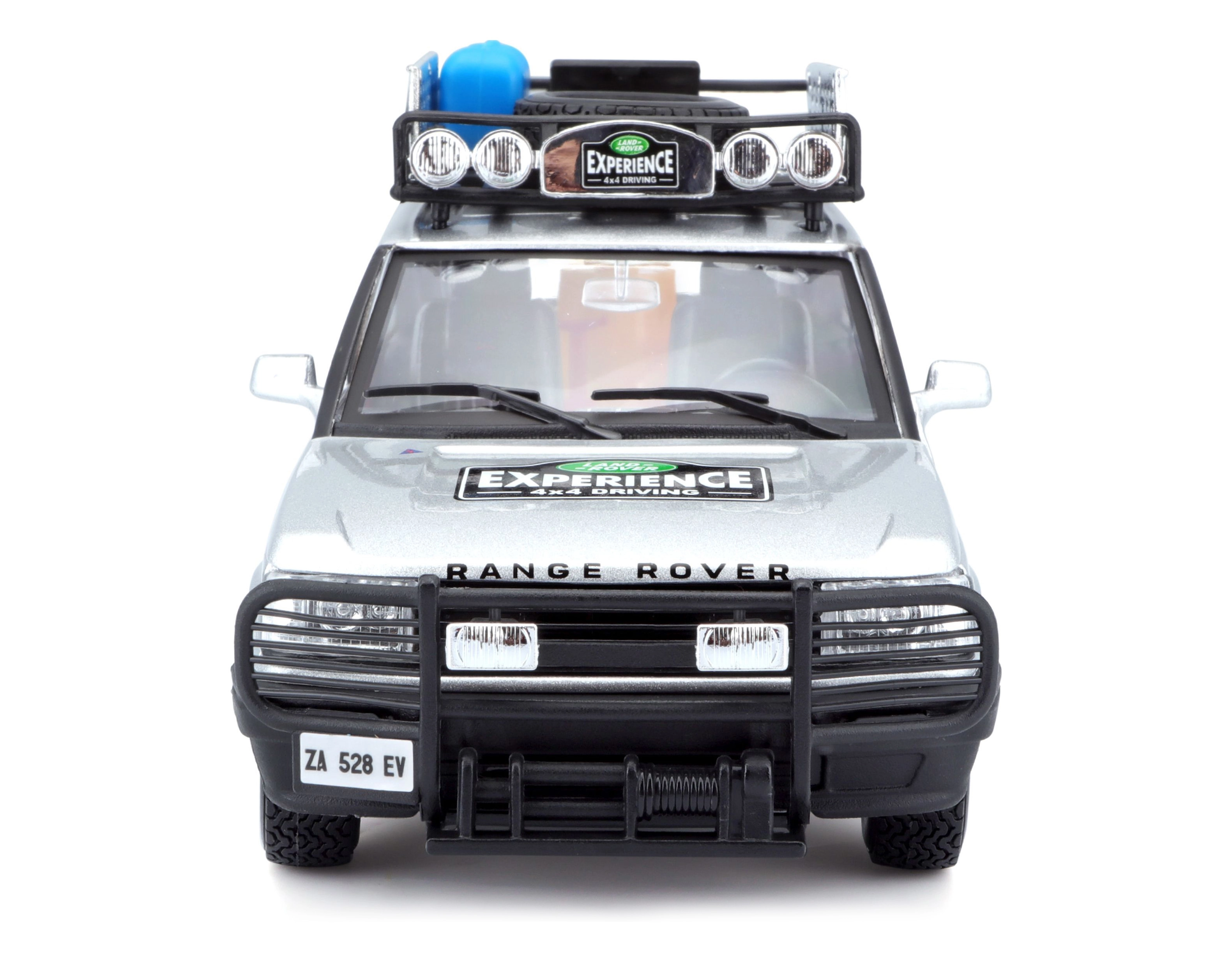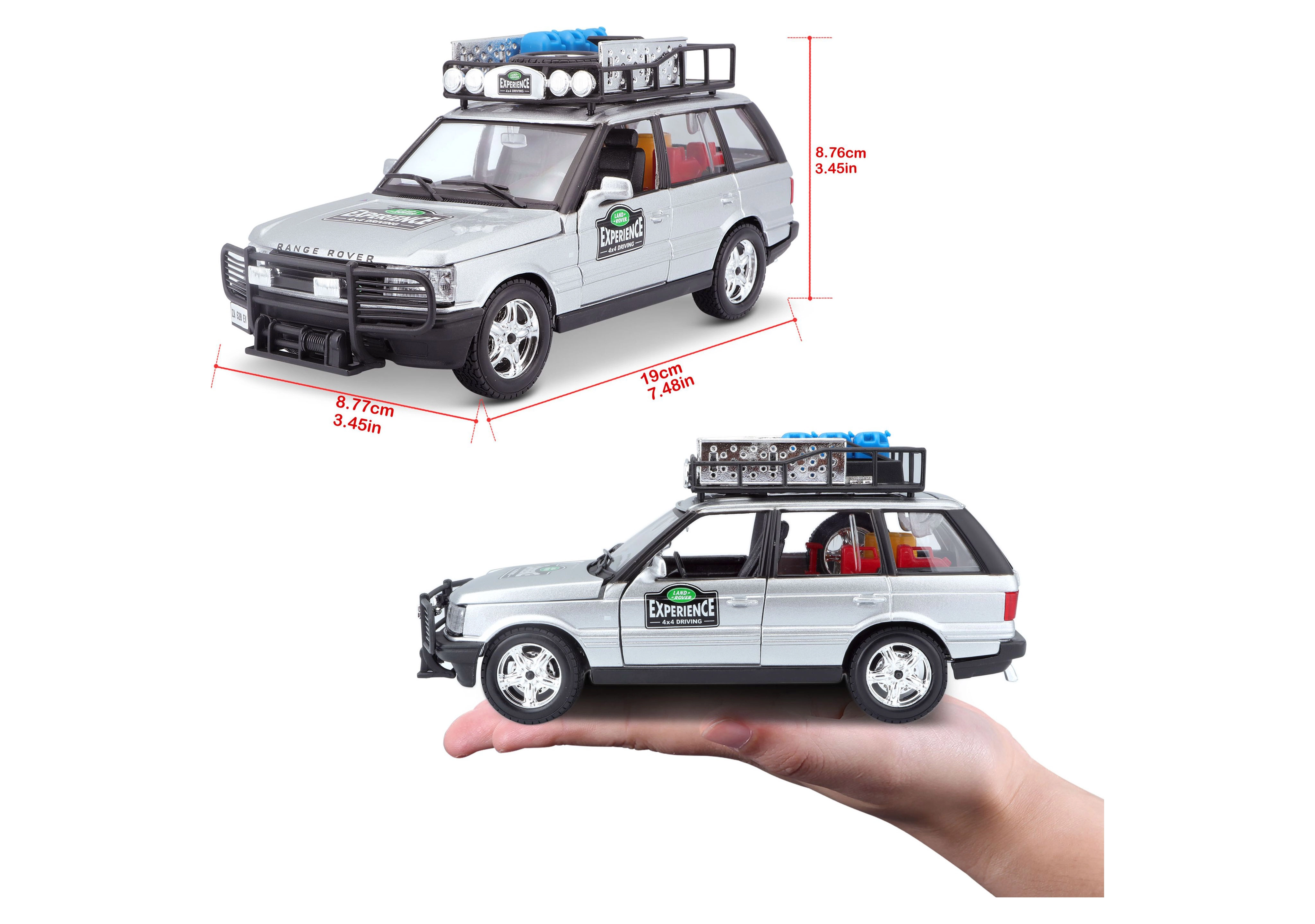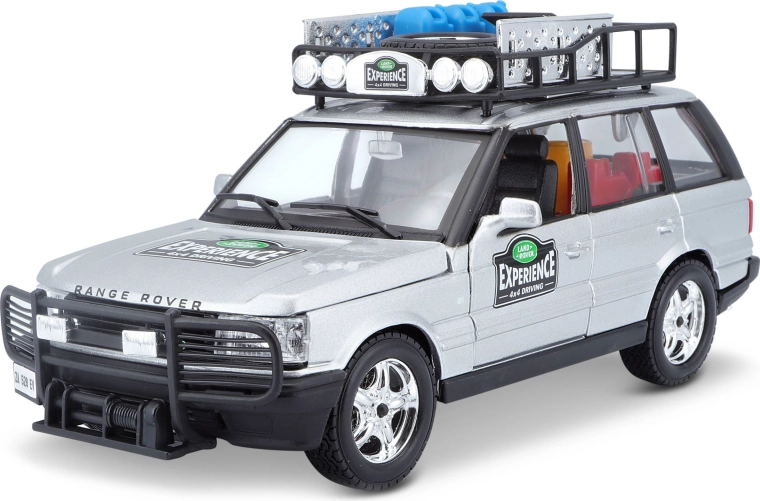 Dieses präzise gefertigte RANGE ROVER Modell im Maßstab 1:24 bietet authentische Details, die jeden Fan von Geländewagen begeistern. Die silberne Karosserie, ergänzt durch einen Dachträger mit Zubehör, einen vorderen Schutzbügel und realistische Decals, schafft einen attraktiven Look zum Spielen und Ausstellen.