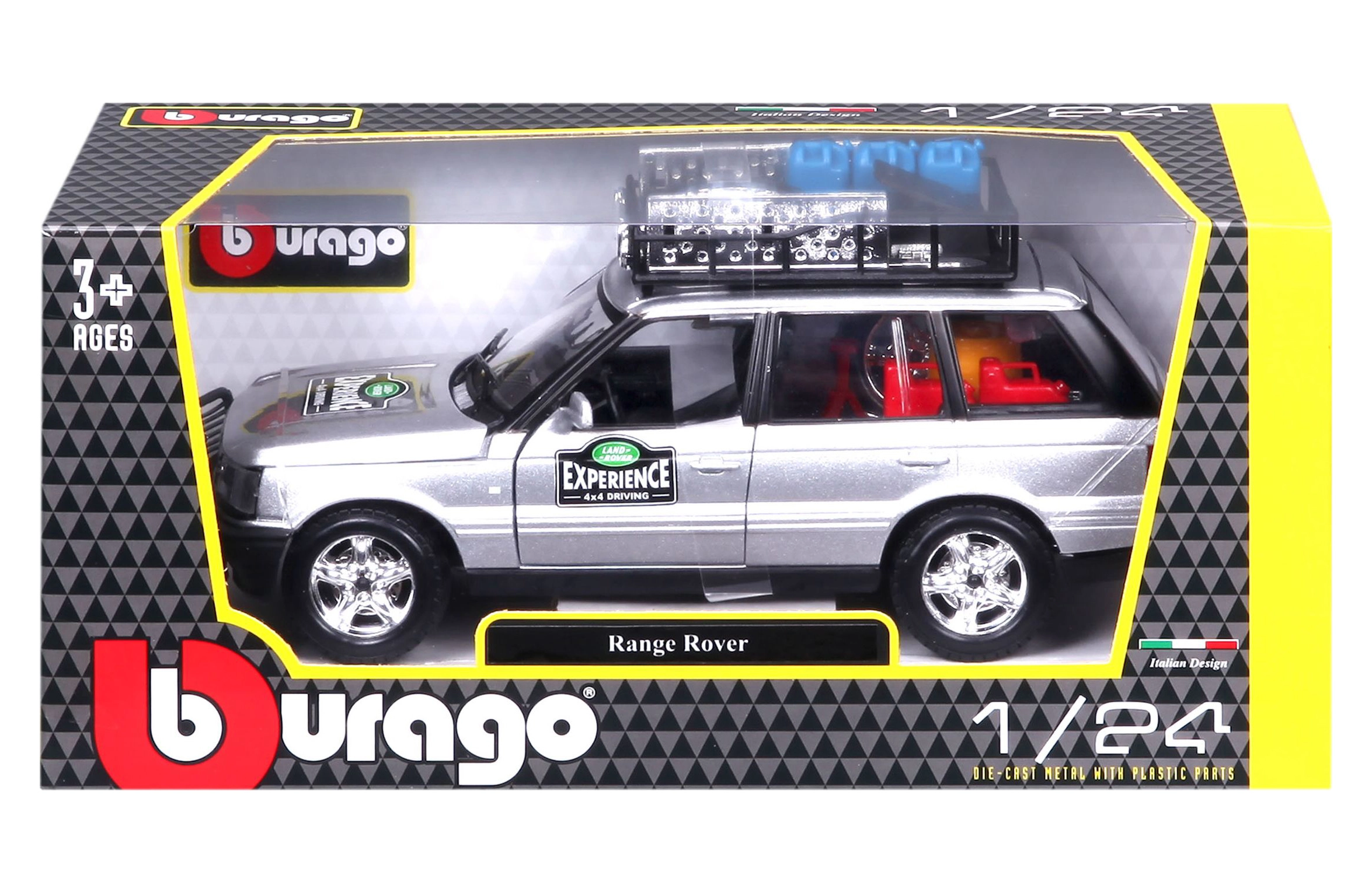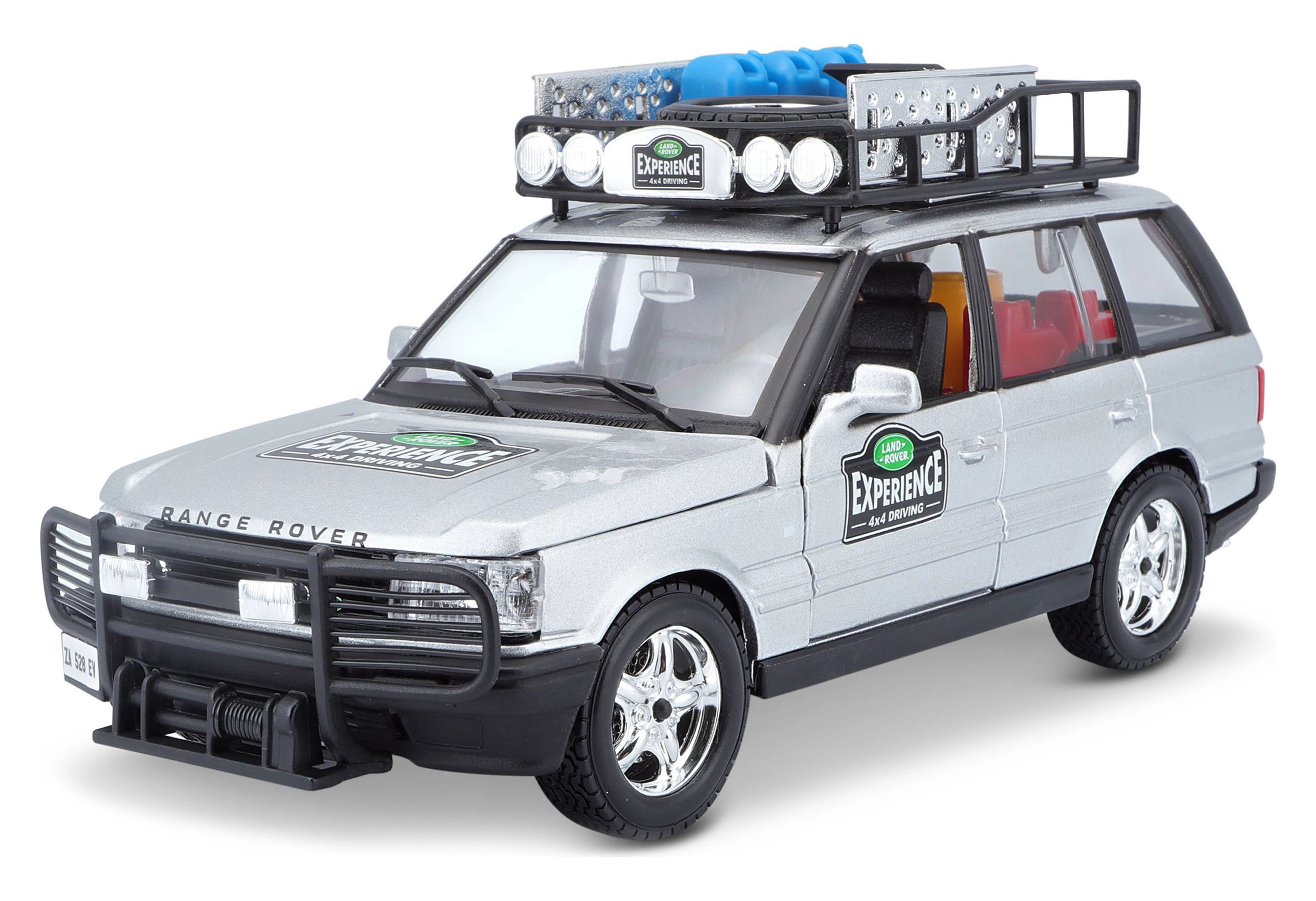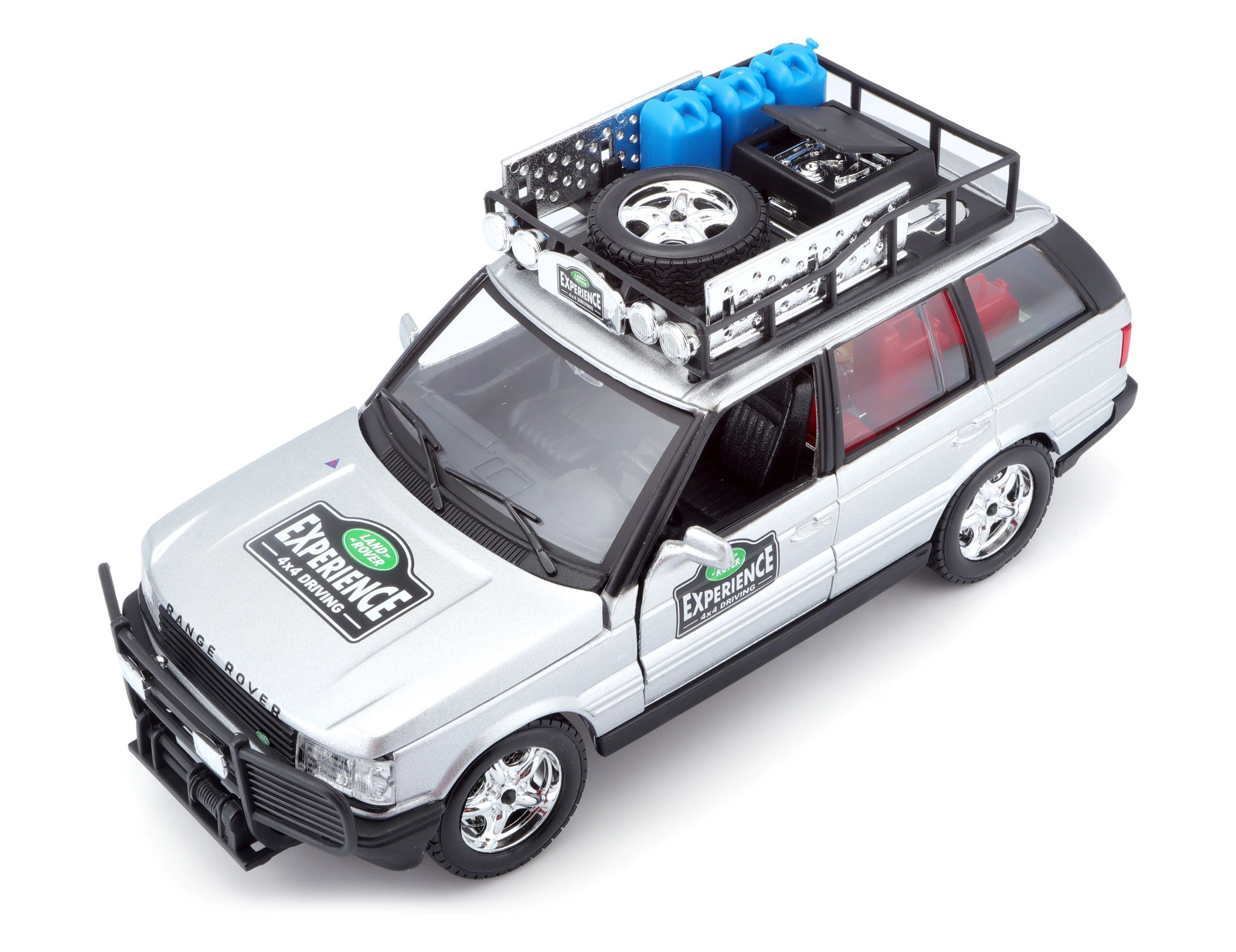 Dieses präzise gefertigte RANGE ROVER Modell im Maßstab 1:24 bietet authentische Details, die jeden Fan von Geländewagen begeistern. Die silberne Karosserie, ergänzt durch einen Dachträger mit Zubehör, einen vorderen Schutzbügel und realistische Decals, schafft einen attraktiven Look zum Spielen und Ausstellen.