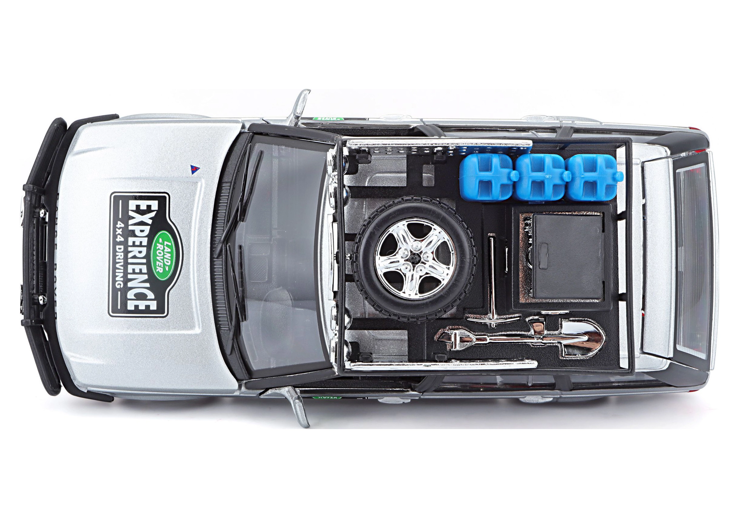 Der Dachträger mit Zubehör – Kanistern, Reserverad, Werkzeug und Zusatzscheinwerfern – verleiht dem Modell einen abenteuerlichen Look.