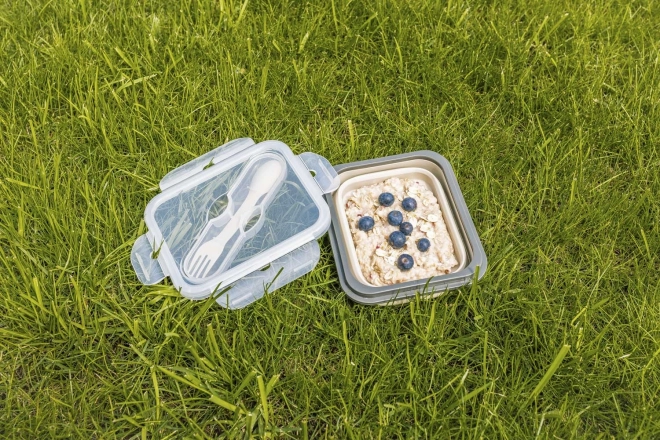Diese Snackbox besteht aus sicherem, lebensmittelechtem Silikon, das ungiftig und bruchsicher ist. Ein großer Vorteil ist das einfache Zusammenklappen, wodurch sie ihr Volumen um bis zu 60 % reduziert und so zum idealen Begleiter für Ausflüge wird. Der Deckel schließt sehr gut und hat ein integriertes Fach für Besteck; Löffel und Gabel sind in einem praktischen Etui enthalten.