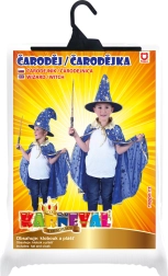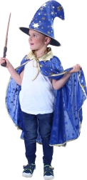 Das perfekte Set für alle kleinen Hexen oder Zauberer auf einer Party oder einem Karneval! Enthält einen blauen Zaubermantel mit goldener Borte und Sternen sowie einen passenden Hut.