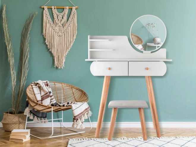 Funktionaler, minimalistischer Schminktisch im skandinavischen Stil kann eine großartige Ergänzung für ein Mädchenzimmer sein. Der weiße Schminktisch mit rundem Spiegel, geräumigen Schubladen und einem bequemen Hocker ist ideal zum Schminken, Haare kämmen, Outfit richten und sogar zum Tagebuchschreiben.