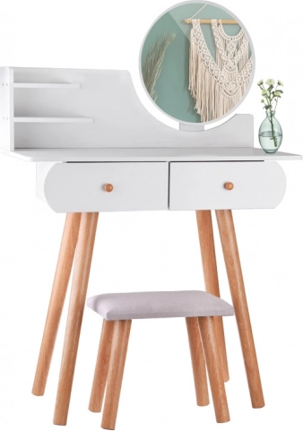 Der skandinavische Stil, den Designer bereits vor Jahren lieben gelernt haben, passt perfekt in jedes minimalistische Zimmer. Moderne Haushalte greifen immer häufiger zu dieser Möbelästhetik und schätzen ihren minimalistischen Charakter und die neutralen Farben. Daher fügt sich dieser Schminktisch ideal in dieses Ambiente ein. Sein schlichtes Design und die hellen Farben lassen ihn in jedem Raum gut wirken. Das Möbelstück besteht ausschließlich aus MDF-Holzplatte. Die Selbstmontage ist erforderlich und die Lieferung erfolgt mit einer ausführlichen, bebilderten Anleitung.