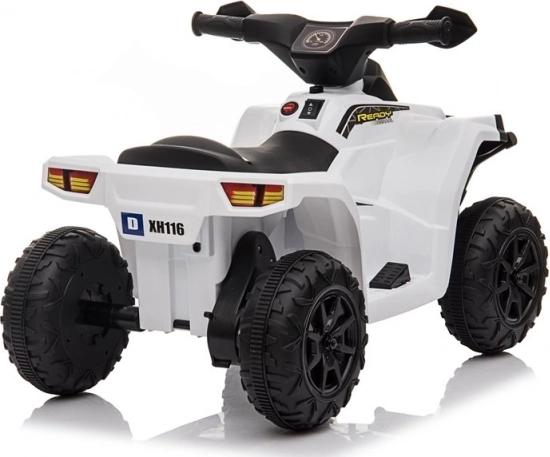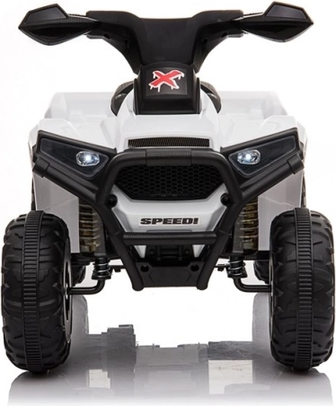 Weißes elektrisches Kinder-Quad für die ersten Fahrten kleiner Rennfahrer. Dank der robusten Räder, der einfachen Steuerung am Lenker und der langlebigen Kunststoffkonstruktion bietet es jede Menge Spaß drinnen und draußen.