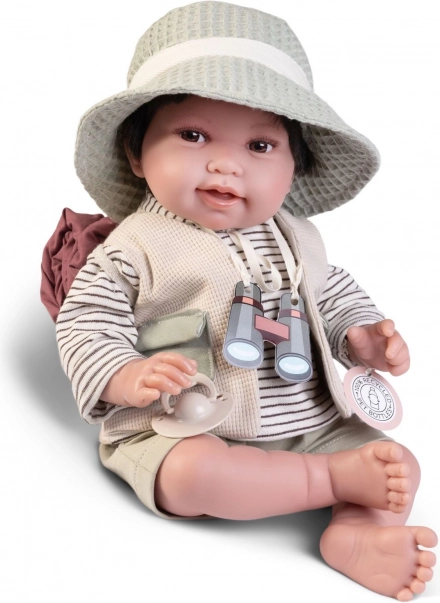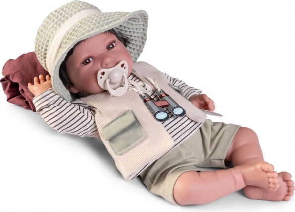 Die Puppe hat realistische Merkmale im Gesicht und an den Gliedmaßen, was sie zu einem idealen Accessoire für Kinderspiele macht.