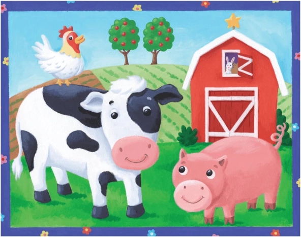 Bauernhof (Kuh, Ferkel, Hahn, Häschen, Apfelbäume)