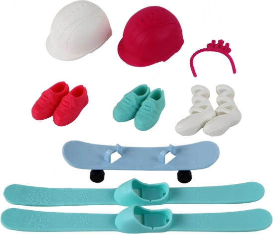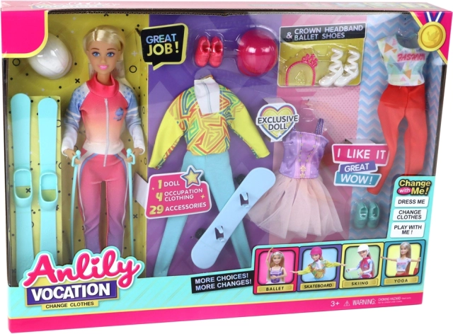 Die Puppe ist mit einem Skianzug, weißem Helm, weißen Winterstiefeln, Skiern und Stöcken ausgestattet. Das ist jedoch noch nicht alles! Zum Set gehören außerdem ein Ballerina-Kostüm (lila Outfit mit rosa Tüllrock, rosa Haargummi und weißen Ballettschuhen), ein Skateboard-Outfit (blaues Skateboard, gelbe Langarmbluse, blaue Hose, rosa Helm und rosa Sportschuhe) sowie ein Yoga-Outfit (bequeme orangefarbene Hose, buntes Kurzarmoberteil und mintfarbene Sportschuhe).