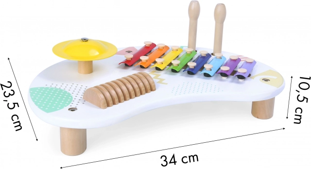 Der Musikspieltisch von ECOTOYS ist die ideale Wahl für kleine Musikerinnen und Musiker. Er bietet ein vielseitiges 8-töniges Xylophon, ein klar klingendes Becken und ein hölzernes Guiro für rhythmische Begleitungen. Mit den zwei Holzschlägeln probieren Kinder mühelos verschiedene Klangfarben aus und trainieren die Hand-Auge-Koordination.
