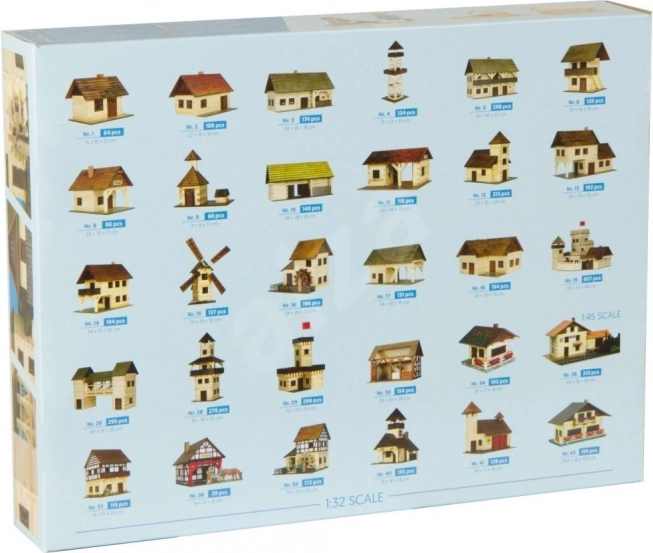• Lieferumfang: Holzleisten in vorgegebenen Längen, Teile für Dächer und Giebel, Kartonausstanzungen für Fenster und Türen, vorgedruckte Papierdekore, schematischer Montageplan.