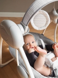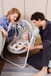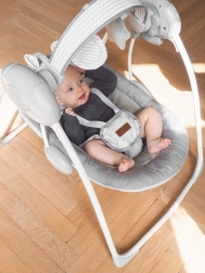Die Schaukel LISS kann mit voreingestellter Geschwindigkeit schaukeln und sich ausschalten, wann immer Sie es möchten. Sie spielt angenehme, beruhigende Melodien und bietet schöne, fröhliche Spielzeuge. Außerdem ist sie bequem, sicher und tragbar. Sie ist vielseitig – fast wie Mama!
