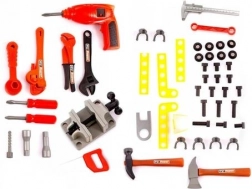 Das Set enthält mehr als 50 Teile: Akkubohrer, Schraubstock, Säge, Hammer, Axt, Zange, Gummihammer, Schraubenzieher, Schlüssel und weiteres Zubehör wie Schrauben, Muttern, Verbinder und Haken.
